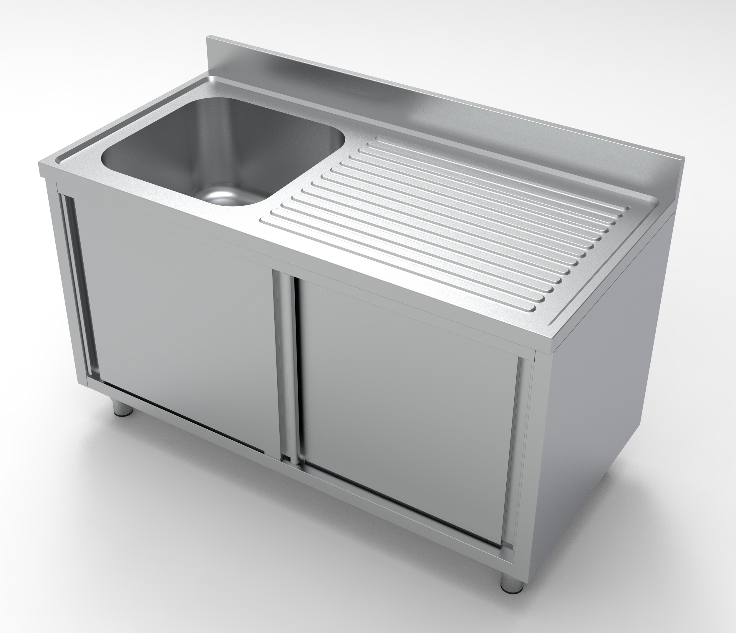 Der 700 Spültisch ist aus hochwertigem Edelstahl gefertigt, was ihn besonders langlebig und leicht zu reinigen macht. Die Schiebetüren ermöglichen einen einfachen Zugang zum Spülbecken und bieten gleichzeitig Schutz vor Spritzwasser und Verschmutzungen. Die linke Arbeitsfläche von 1400 mm bietet ausreichend Platz für das Vorbereiten von Geschirr und das Abstellen von Spülutensilien.