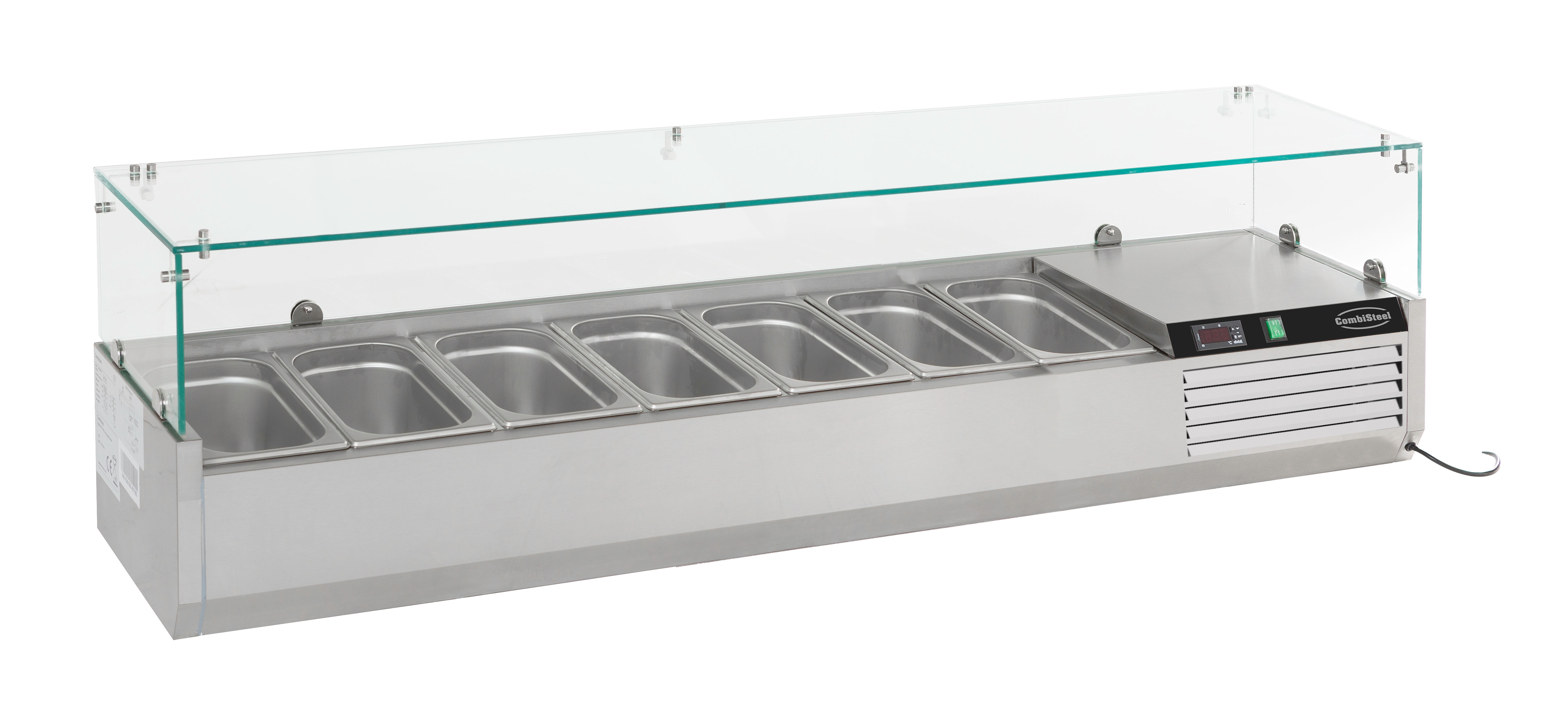 Unsere Aufsatzvitrine 1/4 Gn X 7 ist die ideale Lösung, um Ihre Speisen ansprechend zu präsentieren und gleichzeitig frisch zu halten. Mit ihrem modernen Design und ihrer hochwertigen Verarbeitung ist sie ein unverzichtbares Element in jedem gastronomischen Betrieb.