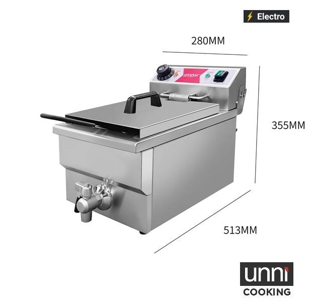 Die kompakte elektrische Tischfritteuse von UnniCooking ist die perfekte Lösung für professionelle Küchen, Buffets und Veranstaltungen. Sie überzeugt durch Effizienz, einfache Handhabung und ein großzügiges Fassungsvermögen.