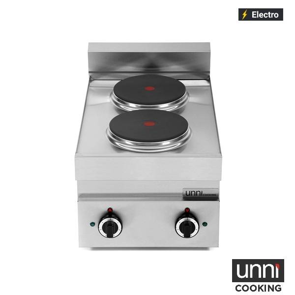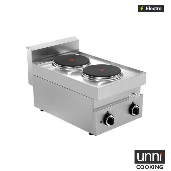 - 2-Flammen-Elektrokochfeld aus langlebigem AISI 304 Edelstahl (8/10 Stärke) mit AISI 430-Beschichtung