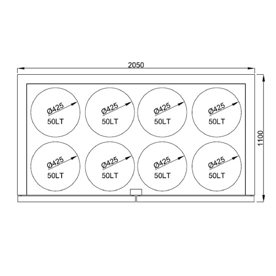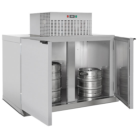 Möbel in Paneelbauweise mit Exenterhakenverschlüssen. Verstärkter Edelstahlboden für die Lagerung von Fässern. Polyurethan Isolation 80 mm Wandstärke.