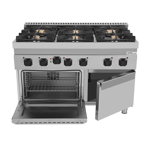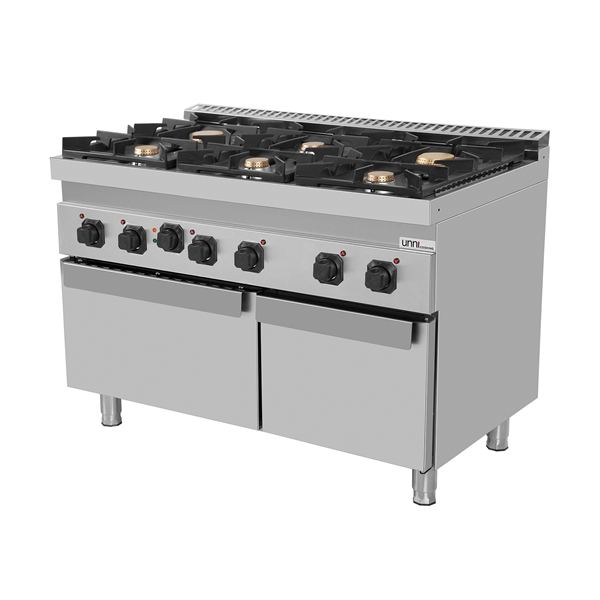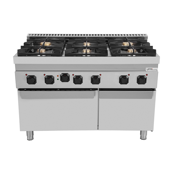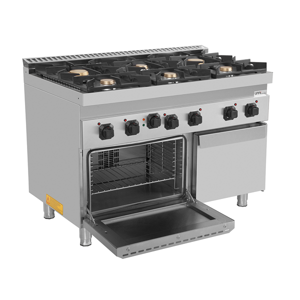 Dieser Herd vereint leistungsstarke Gasbrenner mit einem praktischen Elektro-Ofen. Ideal für professionelle Küchen, die Flexibilität und Effizienz benötigen.