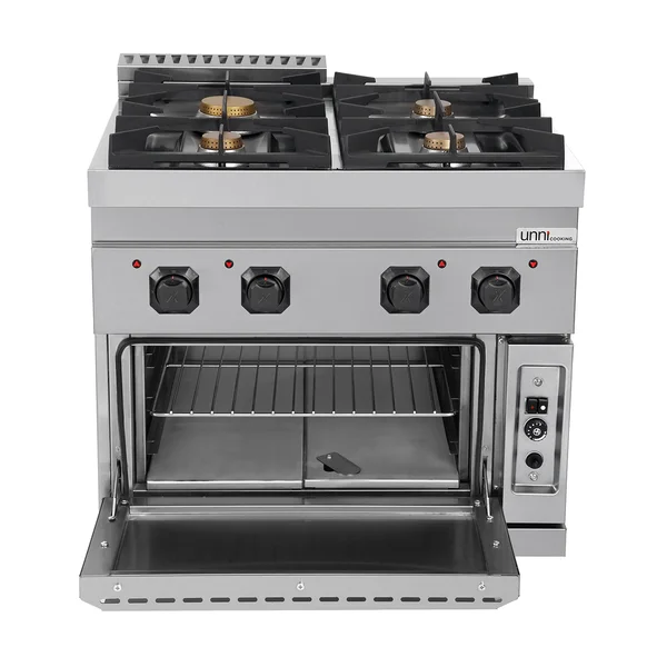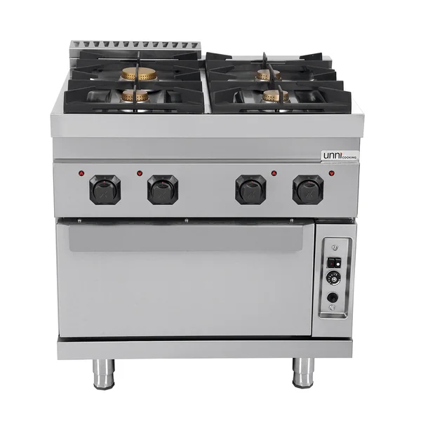 Professionelles Standgerät der Serie UNNI 700 mit vier leistungsstarken Gasbrennern und integriertem Gasbackofen. Entwickelt für den intensiven Einsatz in der Gastronomie mit hoher Gesamtleistung und robusten Gusseisenrosten.