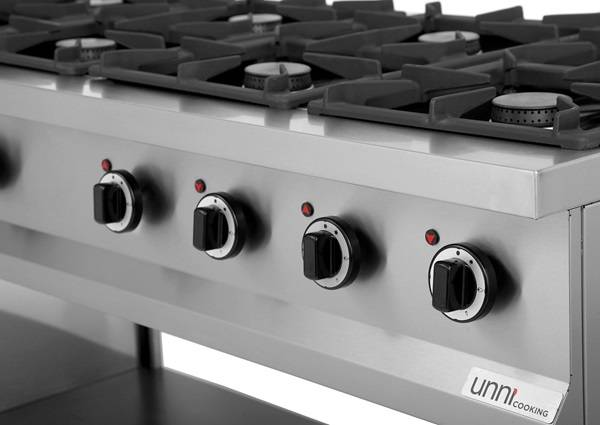 Der UnniCooking Gasherd OCK-8 kombiniert starke Brennerleistung mit effizientem Energieeinsatz. Die verbesserten italienischen Brenner erzeugen intensive Doppel-Überlappflammen mit bis zu 6,5 kW pro Brenner – ideal für schnelles Anbraten, Sautieren oder kontrolliertes Köcheln. Robuste Materialien und durchdachte Details sorgen für zuverlässigen Betrieb im professionellen Küchenalltag.