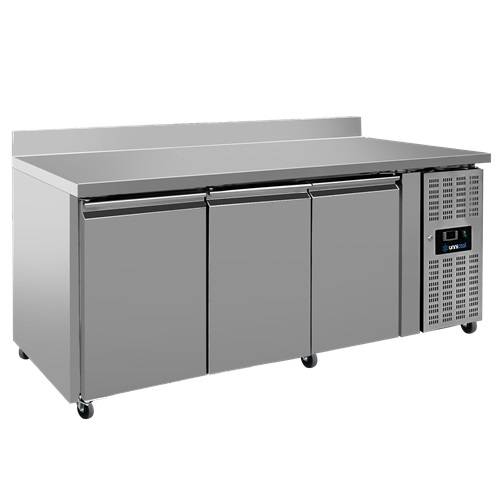 Die 3-türige Kühltheke UNN3200TN bietet effiziente Kühlung mit R290 Kältemittel, Zwangskühlung und automatischem Abtausystem. Vier Lenkrollen, zwei mit Bremse, ermöglichen flexible Positionierung in der Küche.