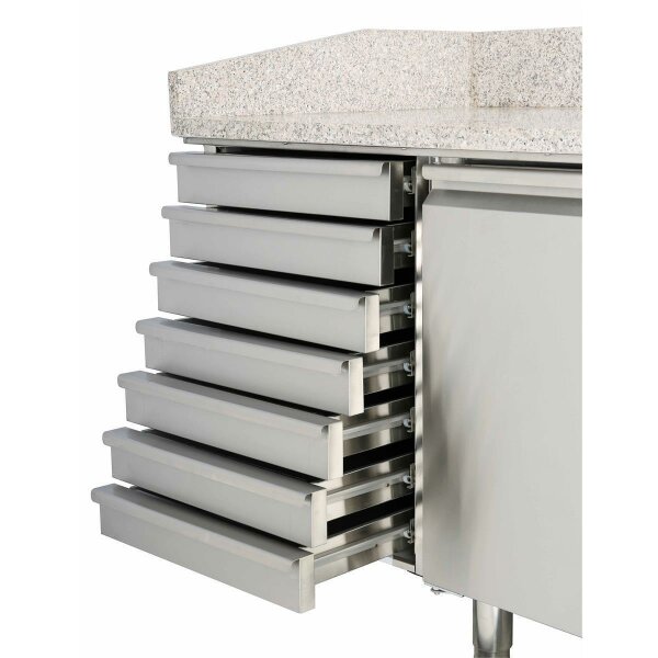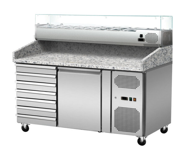 Pizzakühltisch Granit rosa/grau, 7 ungekühlte Schubladen 1 Tür, -2° bis +8° C, 1510x800x860, mit Kühlaufsatz 5x GN1/3 + 1x GN1/2 mit Glasaufsatz