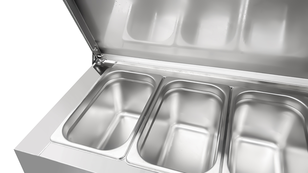 Professionelle Saladette mit gekühltem Unterbau und praktischem GN-Aufsatz für die strukturierte Vorbereitung frischer Zutaten. Dank Zwangsluftkühlung und automatischem Abtauen bleibt die Temperatur konstant zwischen +2 °C und +8 °C.