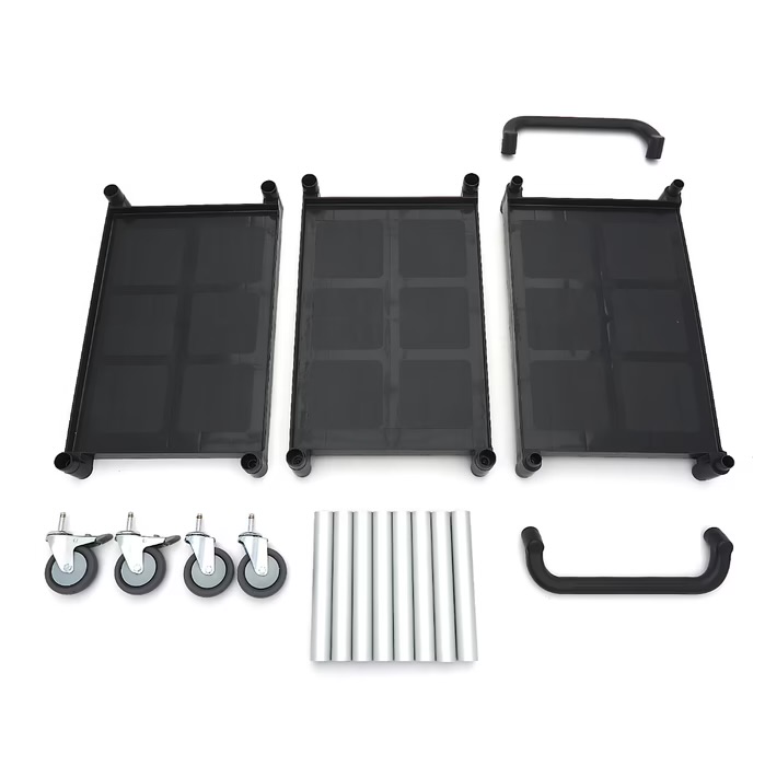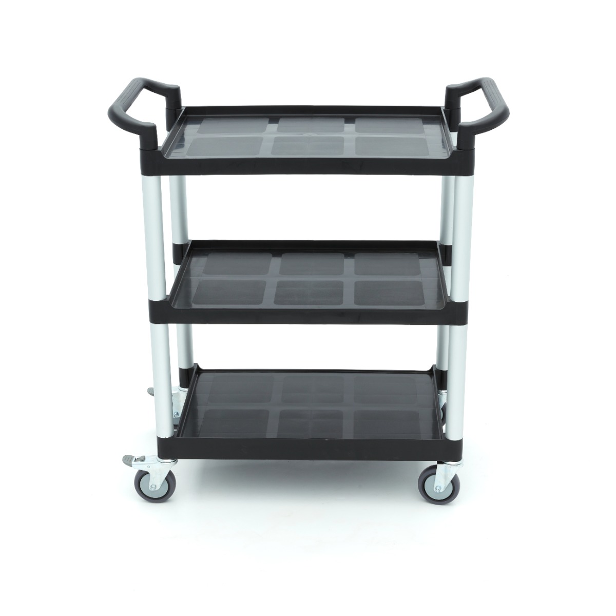 Der professionelle Servierwagen verfügt über drei stabile Kunststoffböden, die jeweils mit bis zu 50 kg belastet werden können. Die Etagen sind an den Rändern leicht erhöht, um das Herunterfallen von Geschirr oder Tabletts zu verhindern. Dank der vier leichtgängigen Rollen – zwei davon mit Feststellern – lässt sich der Wagen sicher und flexibel in jede Richtung bewegen. Seine glatten Oberflächen und abgerundeten Ecken gewährleisten eine einfache und sichere Handhabung.