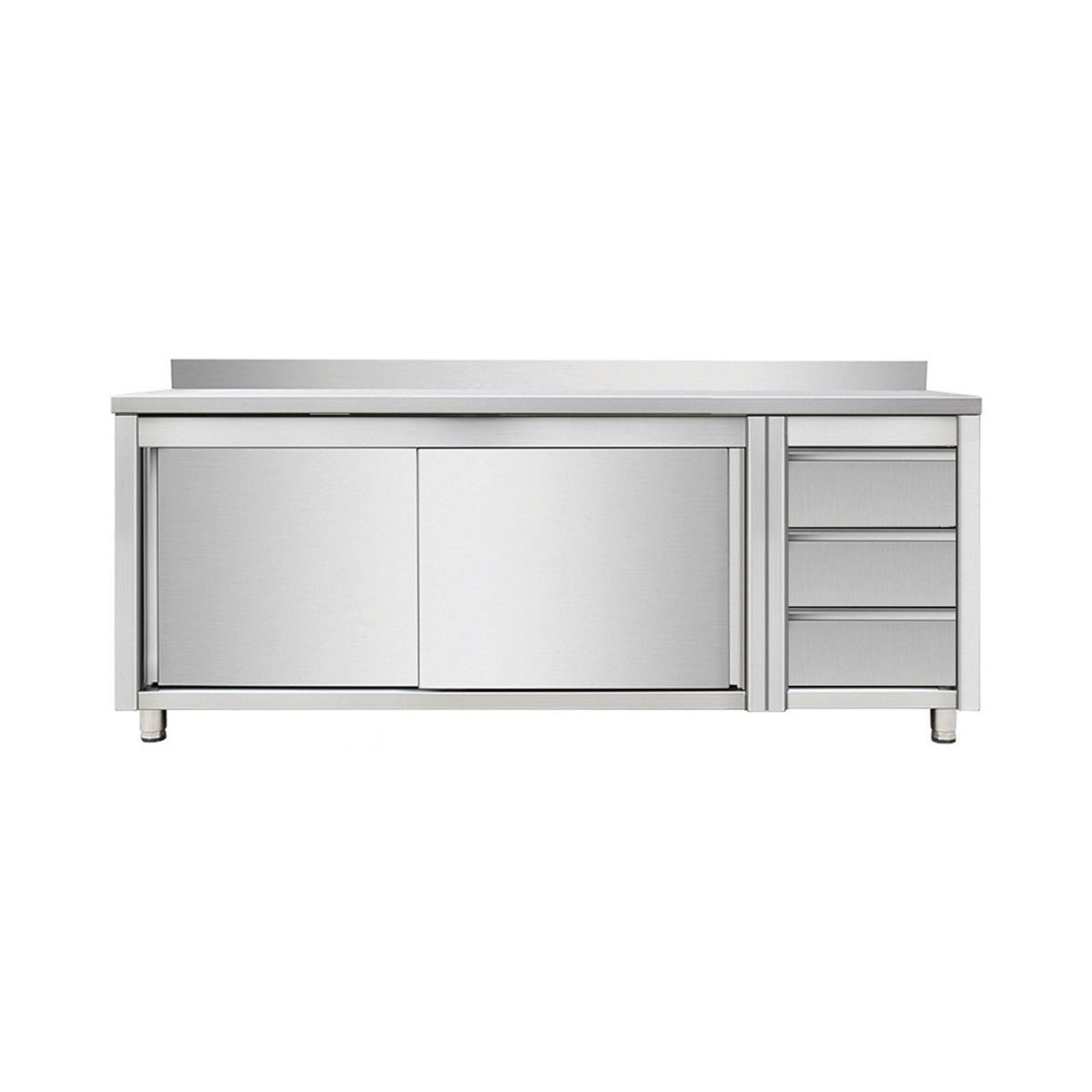 Der Skyrainbow Arbeitsschrank aus Edelstahl AISI 201 kombiniert einen 3er-Schubladenblock rechts mit doppelwandigen Schiebetüren links. Die 40 mm starke, vollflächig mit Holz verstärkte Arbeitsplatte besitzt eine 3D-Aufkantung (H 100 mm, Stärke 20 mm) – ideal für hygienische Wandabschlüsse.