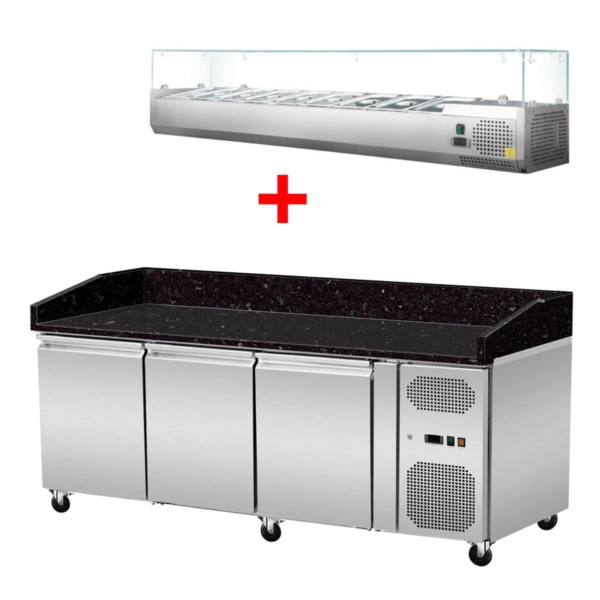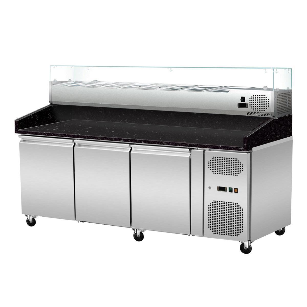 Skyrainbow Pizza-Kühltisch – Granit Star Galaxy schwarz, 3 Türen, 202,5×80×86 cm