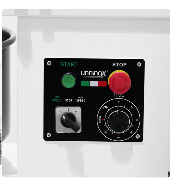 Mit zwei Mischgeschwindigkeiten lässt sich der Teigmischer an verschiedene Teigarten anpassen. Dadurch eignet sich das Gerät für unterschiedliche Anwendungen in der Gastronomie.