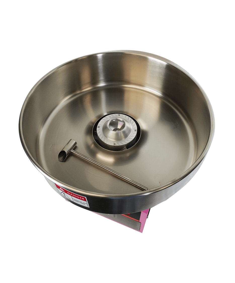 Die Zuckerwatte-Maschine 520 funktioniert, indem sie Zucker in den Behälter gibt, der dann durch die rotierende Schüssel geschleudert wird, um flauschige Zuckerwatte zu erzeugen.